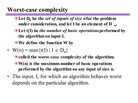 Let us define the function w by wn equals to maximum of ti (where i is an element of Dn) i.e. out of all the possible execution time whichever is maximum will be the worst time complexity.