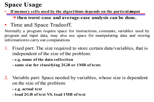 Spcae Complexity – Next is the space usage to execute any algorithm. we also find the cost in terms of the space, which means how much memory cell will be required to run the algorithm. For the different size of input, you need a different memory and then you are going to find the worst case. (i.e., maximum memory cells required)