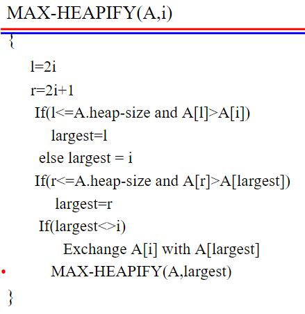 - Repeat steps 2-5 until node i is larger than both its children or until it becomes a leaf node (has no children).