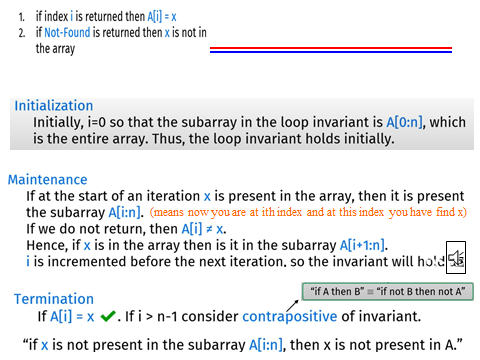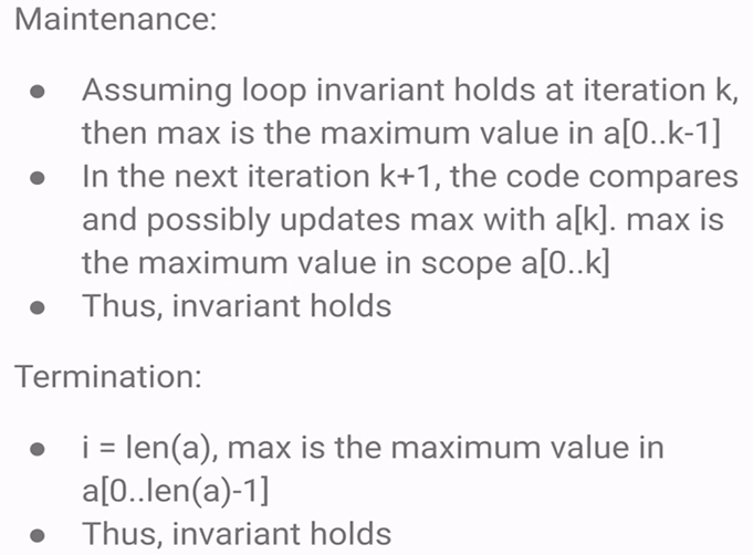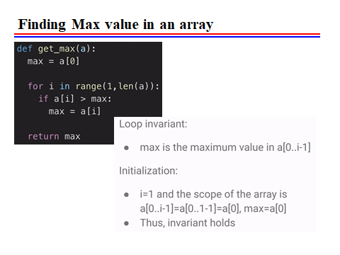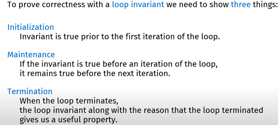 - If the loop invariant is true before an iteration, it must remain true after the iteration.