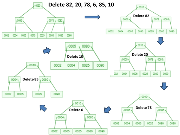 Example Btree of order 4 -Delete 82, 20, 78, 6, 85, 10