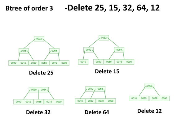 Example 2 – Btree of order 3 -Delete 25, 15, 32, 64, 12