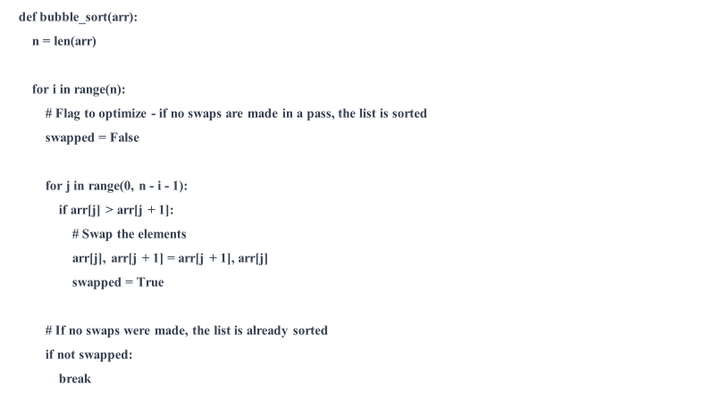 - Termination: The sorting process continues until no more swaps are needed during a pass. At this point, the entire list is sorted.