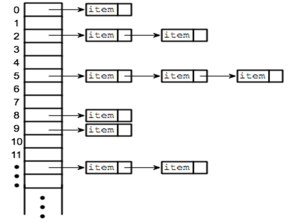 - If there is any collision (i.e. two different elements have same hash value) then store both the elements in the same linked list.