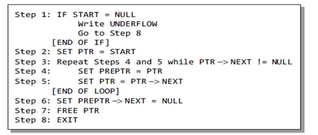 Step 4: Finally, the memory occupied by the node pointed by PTR (initially the first node of the list) is freed and returned to the free pool.