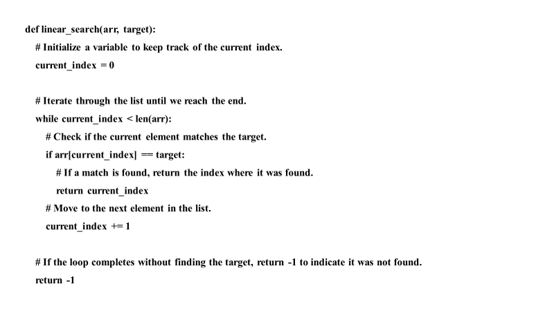 Here’s a simple example of a linear search implemented in Python. In this example, we’ll write a function that performs a linear search to find a target element in a list: